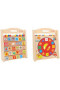 Alfabetiere figurato con grafica applicata, abaco con 30 grani colorati e orologio. Gioco a carattere educativo. Materiale legno. Misure 26 x 30 x 2 cm.